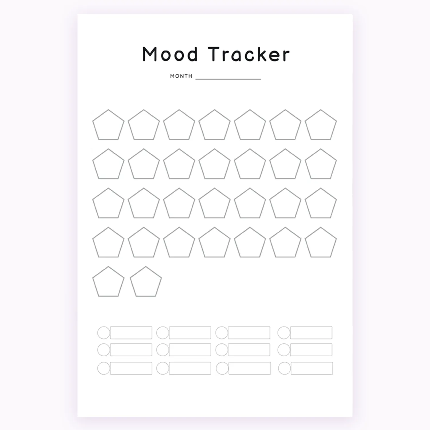 Stay mindful of your emotions with this Monthly coloring mood tracker with pentagon day shapes and circle key labels, designed as a premium instant download PDF for A4 and A5 journal sizes.