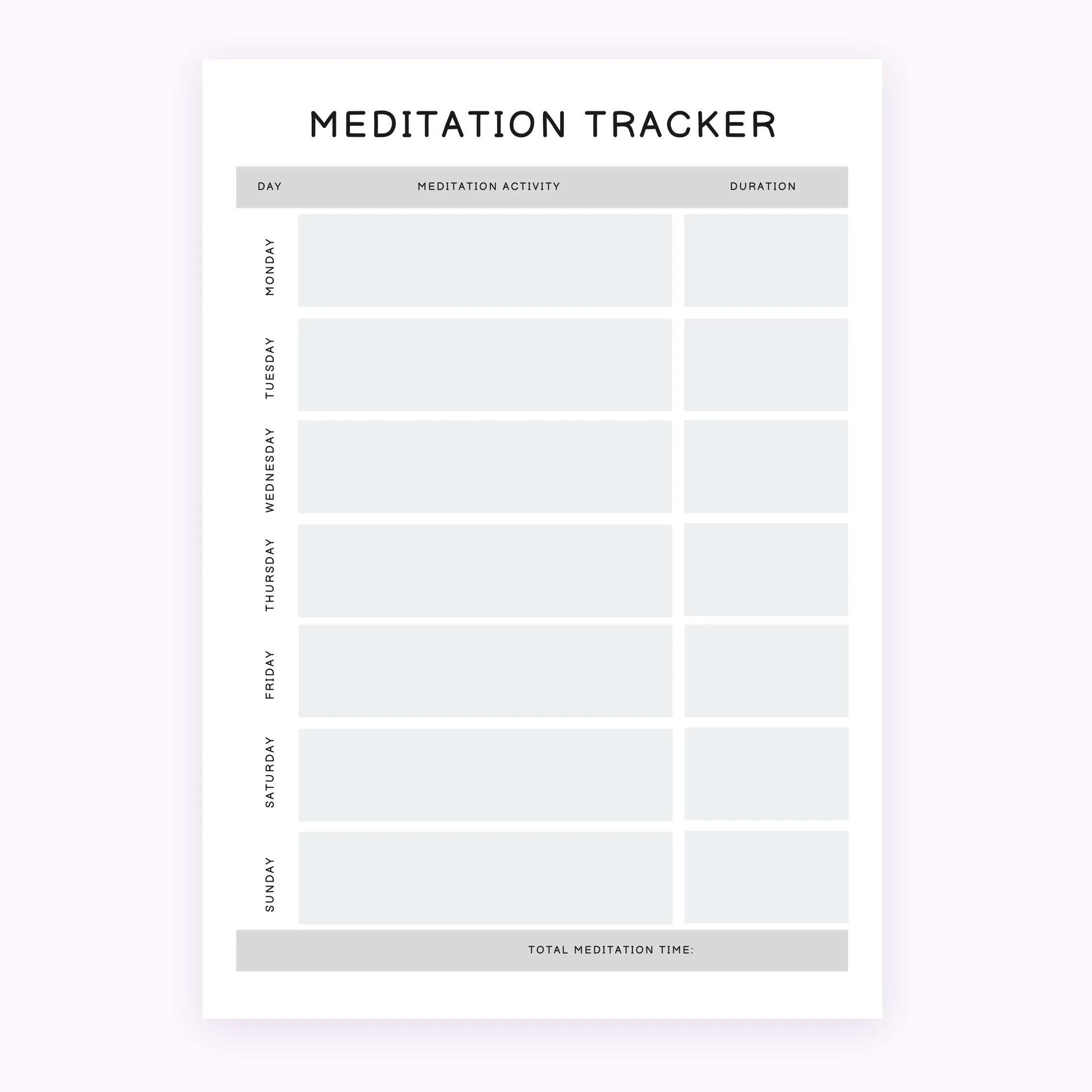 Elevate your mindfulness routine with our professional Printable Meditation Tracker. This clean and organized layout allows you to document your daily practice, helping you stay committed to your wellness goals. Whether you are a beginner or an experienced practitioner, this tracker provides the structure needed to maintain a consistent meditation habit.